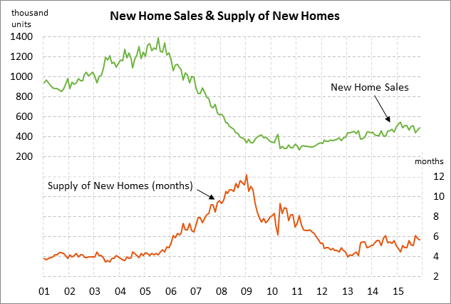 In the bigger picture, new home sales remain relatively strong at only 11% below the 7-3/4 year high of 545,000 units posted in Feb 2015.  Some potential home buyers may be getting cold feet from January’s financial market turbulence and from relatively high new home prices, but new home sales should remain fairly steady given decent consumer confidence and very affordable mortgage rates. The median price of a new home in November of $305,000 was only -1.7% below the record high of $310,400 posted in Sep 2015.