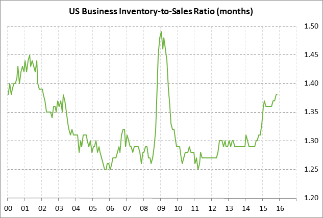 U.S. business inventories are high and continue to be a threat to U.S. GDP growth  — The market is expecting today’s Dec business inventories report to show an increase of +0.2%, reversing November’s -0.2% decline.  U.S. inventories are at elevated levels as seen by the fact that the business inventory-to-sales ratio in November was at a 6-1/2 year high of 1.38 months.  The current level of inventories of 1.38 months is well above the 1.29 average seen in 2006/07 before the 2007/09 recession, illustrating that the U.S. economy needs to see a larger inventory correction before businesses will be under pressure to order new goods to replenish their shelves.  An inventory correction already subtracted -0.7 points from Q3 GDP and -0.5 points from Q4 GDP and the inventory correction has further to go, which will keep downward pressure on GDP in the first half of 2016.