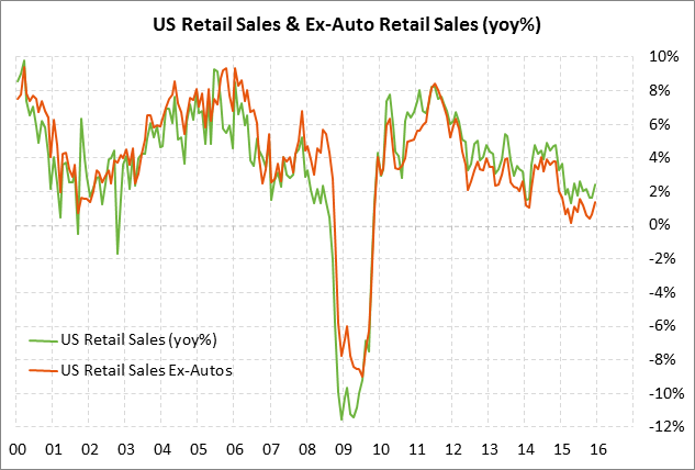 U.S. retail sales expected to show another lackluster month — The market is expecting today’s Jan retail sales report to show a small headline increase of +0.1% m/m and to be unchanged ex-autos.  That would be slightly better than the Dec report of -0.1% for both the headline and ex-autos figures.  Excluding both autos and the effect of low gasoline prices in pushing down the dollar value of retail sales, the market is expecting today’s retail sales ex-autos and ex-gasoline to show a little more respectable increase of +0.3% following December’s unchanged report.  In Q4, retail sales showed weak reports of unchanged in Oct, +0.4% in Nov, and -0.1% in Dec.