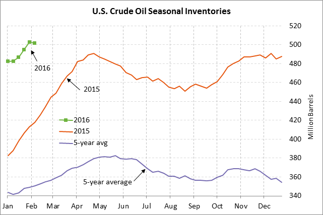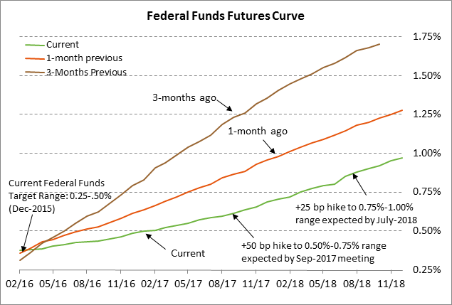 FOMC minutes support deferred Fed rate hike expectations — Yesterday’s release of the minutes from the Jan 26-27 FOMC meeting showed that FOMC officials were worried about overseas turmoil, the U.S. stock market correction and widening credit spreads, and low U.S. inflation figures. Those various problems continued in the three weeks since the FOMC meeting, meaning officials are probably even more concerned now. Fed Chair Yellen at her testimony before Congress acknowledged various headwinds but said that the Fed remained on track to gradually raise interest rates. However, the federal funds futures market does not fully expect the FOMC to implement its next rate hike until late 2018, which is more than a year away. The fed funds futures market is discounting a zero chance for a rate hike at the next FOMC meeting on March 15-16.