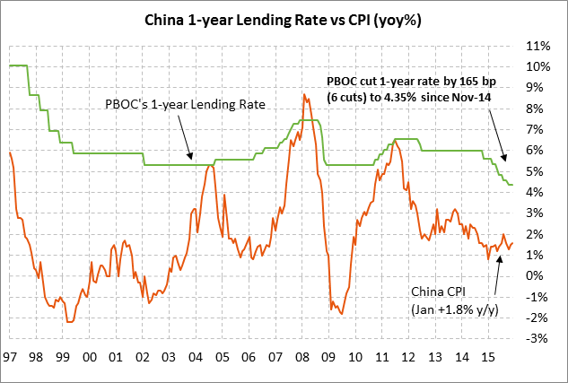 The PBOC has room on the downside to further cut its 1-year lending rate since the current level of 4.35% is well above the Jan CPI rate of +1.8%. The PBOC has already cut the 1-year lending rate by 165 bp to the current level of 4.35% from the 6.00% level seen in late 2014, with the last 25 bp rate cut occurring in Oct 2015. The PBOC last week cut its reserve requirement ratio (RRR) by 50 bp to 17.0%, bringing the overall cut since late 2014 to 300 bp. The PBOC last week cut its RRR ratio to free up another $100 billion of bank lending, avoiding another interest rate cut that could have sparked new weakness in the yuan ahead of the National Congress.