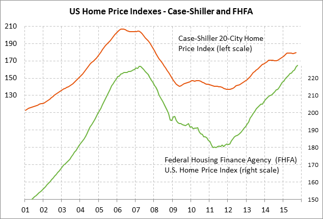 The CaseShiller index has risen by a total of +31% from the 13-year low posted in Jan 2012, but must still rise by another +15% to match the record high posted in April 2006. The FHFA index, by contrast, reached a new record high in October, indicating that U.S. home prices are at record highs when considered across the country in big and small cities and rural areas.