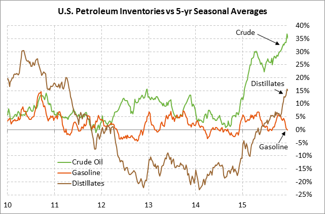Crude oil prices last Wednesday rallied sharply after the EIA reported that U.S. crude oil inventories fell sharply by -5.9 million bbls (-1.2%), more than offsetting the previous week’s rise of +4.8 million bbls (+1.0%). However, the bullish reaction to last week’s EIA report was mainly just year-end short-covering since the decline in oil inventories was due mainly to oil companies cutting their inventories at year-end to minimize taxes, as opposed to any fundamental decline in the oil glut. Even after last week’s decline, U.S. oil inventories were still a massive +35.1% (126 million bbls) above the 5-year seasonal average. Meanwhile, gasoline inventories are close to neutral at -0.2% below average. Distillate inventories are ample at +15.1% above average.