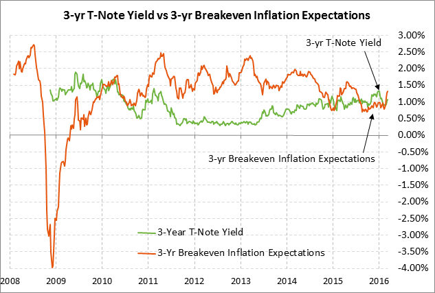 Today’s 3-year T-note issue was trading at 1.09% in when-issued trading late yesterday afternoon. That translates to an inflation-adjusted yield of -0.23% against the current 3-year breakeven inflation expectations rate of 1.32%.