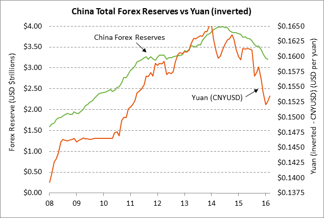 The yuan has fallen sharply by -8.2% since 2014. The recent sharp declines in the yuan in Aug 2015 and again in Nov-Jan caused sharp sell-offs in the Chinese stock market and, in reaction, the global stock markets as well. The U.S. stock market is therefore closing watching the Chinese currency situation. Yesterday’s report of a smaller decline in China’s FX reserves was therefore a supportive factor for the Chinese stock market as well as the U.S. stock market.