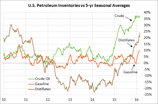 Meanwhile, there are more than ample supplies of U.S. product inventories, which are keeping downward pressure on gasoline and distillate prices. U.S. gasoline inventories are +9.8% above the 5-year seasonal average and distillate inventories are +24.2% above average.