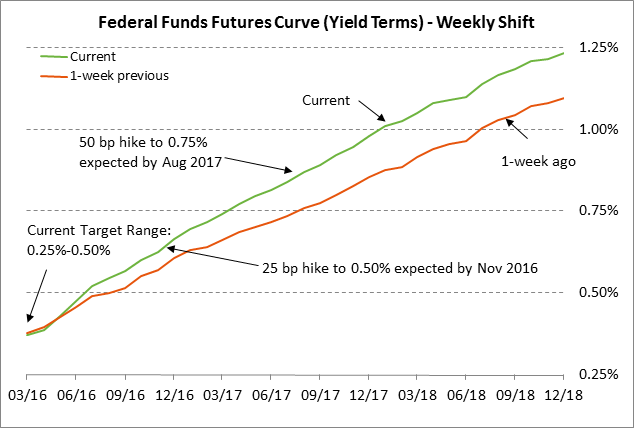 Fed rate hike expectations turn more hawkish — Market expectations for the timing of the Fed’s next rate hike have turned substantially more hawkish in the past several weeks mainly because of the more stable situation in China and the upward rebound in crude oil prices and the U.S. stock market. Just in the past week, the federal funds futures curve has tightened up by +6 bp for the end of 2016, +10 bp for the end of 2017, and +14 bp for the end of 2018. The markets are now fully discounting the Fed’s next 25 bp rate hike by November 2016 and the following 25 bp rate hike by August 2017.