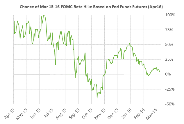 The markets are discounting only a 4% chance for a Fed rate hike this week. The markets have settled down after the turbulence seen in January and February but the Fed will want to make sure that the U.S. economy is not stumbling before it implements its next rate hike, particularly since the U.S. economy came into 2016 on a weak note with GDP growth in Q4-2015 of only +1.0%. The FOMC at its 2-day meeting this week on Tue/Wed will release updated macroeconomic forecasts and Fed Chair Yellen will hold a press conference following the meeting.