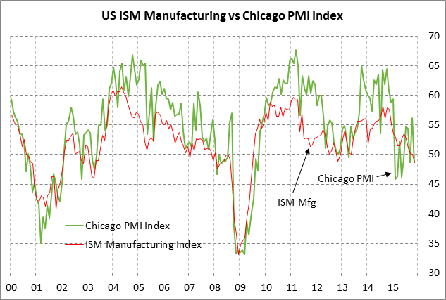 - Chicago PMI report expected to show an upward rebound but remain below the boom-bust level of 50.0