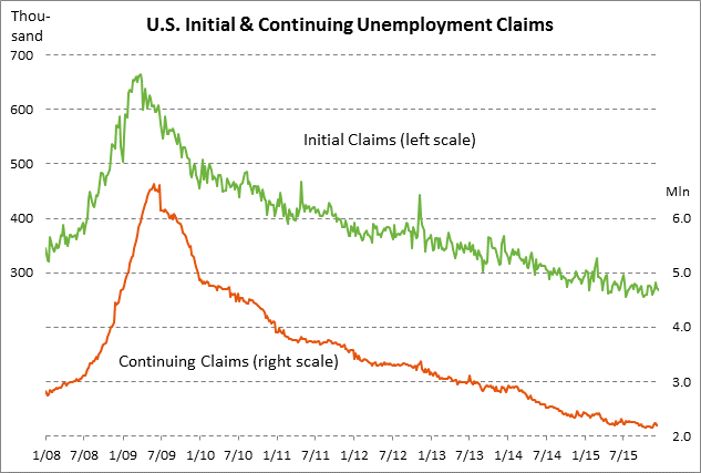 U.S. unemployment claims expected to show small increases but remain in favorable shape — The market is expecting today’s weekly initial unemployment claims report to show a small +3,000 increase to 270,000 after last week’s -5,000 decline to 267,000. Meanwhile, the market is expecting today’s continuing claims report to show a slight +1,000 increase to 2.196 million after last week’s sharp decline of -47,000 to 2.195 million.
