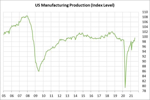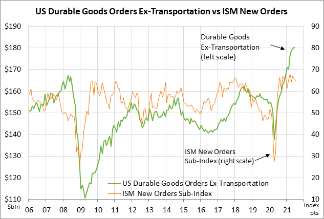 U.S. manufacturing confidence remains strong, although down from the euphoric levels seen earlier this year when vaccinations first became available and the pandemic infection levels dropped sharply. The latest ISM manufacturing index reading was strong at 59.5 in July, although that was down from the 37-year high of 64.7 posted earlier this year in March.