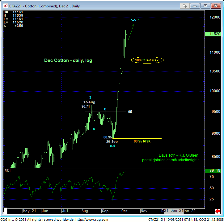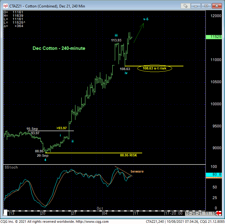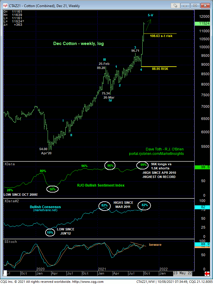 Understandably, market sentiment/contrary opinion levels are at astronomical heights typical of major peak/reversal environments. This said, traders are reminded that sentiment is not an applicable technical tool in the absence of an accompanying confirmed bearish divergence in momentum. Since 20-Sep’s 88.95 larger-degree corrective low is too far away and too impractical at this point to use as a longer-term risk parameter pertinent to longer-term commercial traders, there’s little objective recourse but to tighten bull risk as much as is objectively possible and acknowledge and accept whipsaw risk (back above whatever high is left in the wake of a short-term mo failure) in exchange for much deeper nominal risk below 88.95. Herein lies the importance and function of yesterday’s admittedly tight but objective short-term risk parameter at 108.63.