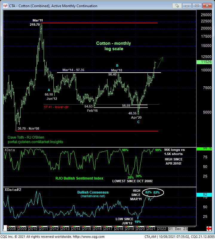 The weekly (above) and monthly (below) log scale charts show the magnificence of this bull trend that’s been the biggest performer across the entire commodity spectrum the past few weeks. The monthly chart shows NO levels of any technical merit above the market shy of 2011’s 219.70 all-time high. This does not mean we’re forecasting a move to 219. But it certainly does mean that until or unless this market stems the clear and present and major uptrend with at least a bearish divergence in short-term momentum, the market’s upside potential remains indeterminable and potentially extreme.
