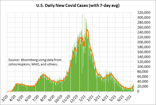 U.S. pandemic statistics surge due to Delta variant — The U.S. Covid infection rate is surging due to the spread of the highly-transmissible Delta variant, which now accounts for more than half of all new U.S. cases. The 7-day average of new U.S. Covid infections on Monday surged to a 1-1/2 month high of 22,961, doubling from the 15-1/2 month low of 11,351 posted only three weeks ago on June 23.