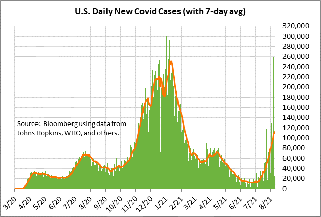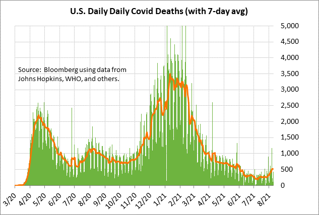 The 7-day average of Covid deaths on Sunday rose to a 2-1/4 month high of 515 deaths, up from early-July’s 6-month low of 185 deaths.