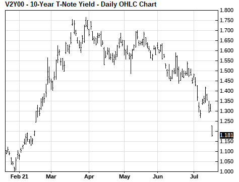 Meanwhile, the bond market confirmed the worries about the delta variant. The 10-year T-note yield on Monday fell by -10 bp to 1.19% and posted a new 5-month low. The 10-year T-note yield has now plunged by a total of -58 bp from March’s 1-1/2 year high of 1.77%.