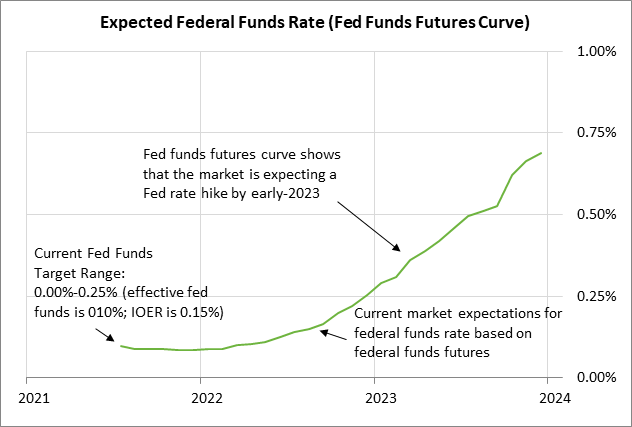 Specifically, the Dec 2023 federal funds futures contract on a yield basis has fallen by -11 bp to 0.69% from the 0.80% level seen last Tuesday. The current Dec 2023 federal funds rate level of 0.69% means the market is now expecting 59 bp of rate hikes by the end of Dec 2023 from the current effective federal funds rate of 0.10%.