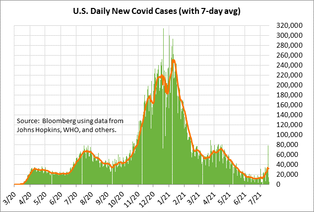 The 7-day average of new U.S. Covid infections reached a new 2-month high of 34,190 on Saturday, which is more than triple the 16-month low of 11,351 posted about a month ago on June 23. On a single-day basis, the number of new Covid infections last Friday surged to a 3-month high of 78,572. The delta variant is spreading mainly among people who have not been vaccinated at all, which is 44% of the U.S. population, according to the CDC.
