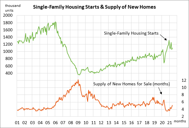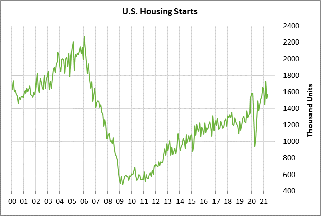 U.S. housing starts remain in very strong shape at only 10% below the 15-year high of 1.725 million units posted in March. U.S. homebuilders remain very confident due to the strong demand for new homes, the tight supply of new homes on the market, and the recent decline in mortgage rates. The 30-year mortgage rate is currently at 2.88%, down by -30 bp from the 1-year high of 3.18% posted several months ago in early April.