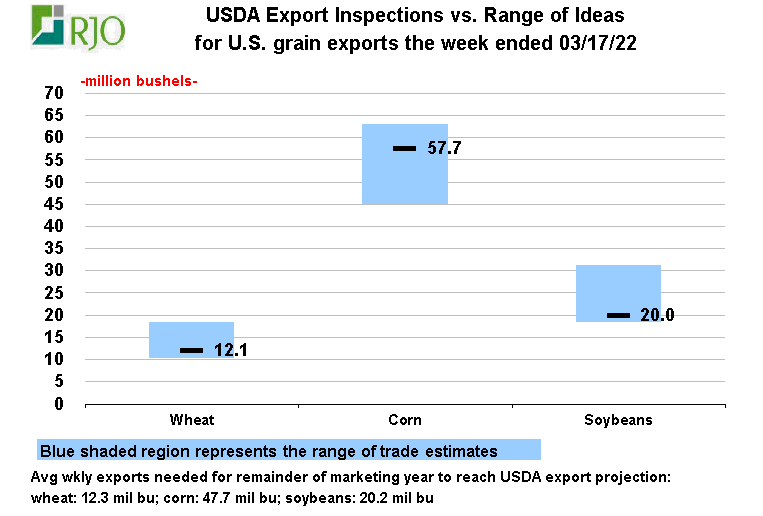 U.S. corn exports, for the week ended 3/17/22, were 1.466 MMT (57.7 million bushels), within market expectations of 1.140-1.600 MMT (44.9-63.0 mil bu), up from the previous week’s 1.147 MMT (45.1 mil bu) but well below last year’s same-week exports of 2.018 MMT (79.4 mil bu), continuing the theme of late as each of the last four weeks’ exports were below year ago levels. Accordingly, cumulative export inspections of 1.078 billion bushels are now down 15.0% from last year’s 1.268 billion after narrowing the deficit to last year to 10.6% in mid-February. More importantly, though, corn shipments over the last six weeks averaged 57.6 million bushels, above the roughly 47.7 million/week average we estimate will be needed through the end of August in order to reach the USDA’s current 2.500 billion bushel export projection. U.S. corn exports from this point forward last year averaged a very strong 55.3 million bushels/week thanks to an aggressive export program to China. This week’s activity included 478k tonnes shipped to China, reducing their outstanding/unshipped U.S. corn purchases to around 5.7 MMT vs 15.1 MMT still unshipped at this time last year. The very likely notably-reduced export program to China during Apr-Aug vs last year is something that will need to be monitored closely moving forward as that reduced demand will need to be replaced by other buyers to maintain the heavy export pace needed to reach the USDA’s export projection. With the reduced Argentine crop and Ukraine’s absence from the export market, obviously prospects are strong for an above average export program in the months ahead, but making up the 7-8 MMT of likely lower exports to China during Apr-Aug than last year is noteworthy task.