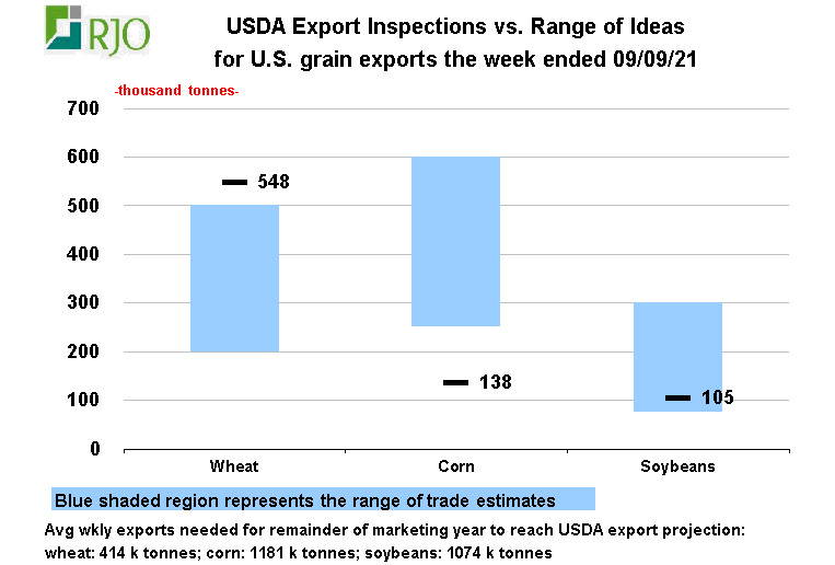 U.S. soybean exports last week were minimal again, as well, at 105k tonnes (3.9 million bushels), little-changed from the previous week’s 91k tonnes (3.3 mil bu, at the bottom of market expectations of 75-300k tonnes (2.8-8.3 mil bu) and compared to last year’s 1.635 MMT (60.1 mil bu) as the new crop export program quickly ramped up. For soybeans, no Gulf loading activity was reported for the week, as well, while PNW ports only loaded 63k tonnes, all to China. Through the first nine days of the 2021/22 marketing year, cumulative export inspections stand at only 5.0 million bushels vs 85.1 million a year ago. Based on the USDA’s 2.090 billion bushel export projection, we estimate soybean export inspections will need to average 39.5 million bushels/week over the course of the marketing year, similar to last year’s 40.6 million/week average from this point forward.