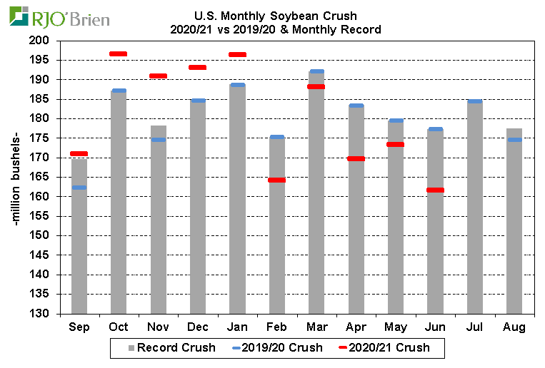 USDA reported U.S. soybean crush in June was 161.7 million bushels, in line with average market expectations of 162.1 million (161.4-163.1 million range of ideas), but down solidly from 173.5 million in May and, more importantly, down 8.8% (15.6 million bushels) from last year’s 177.3 million bushels. June data put marketing year-to-date (Aug-June) crush at 1.806 billion bushels, essentially unchanged from last year’s 1.805 billion, while total crush over the last five months (Feb-Jun) was exactly 50 million bushels (5.5%) less than during the same period last year. The USDA’s 2.170 billion bushel 2020/21 total crush estimate of 2.170 billion bushels is clearly too high as it would require July-August crush of 364 million bushels, 1.4% higher than last year’s 359 million, which clearly appear extremely unlikely given the notable year-over-year reductions seen in recent months. Last year’s July crush was a record 184.5 million bushels, while August crush was a bit off the record but still historically high at 174.7 million bushels. Assuming July crush 7% below last year’s record and August crush down 5% from last year would imply 20/21 total crush of 2.144 billion bushels, 26 million below the USDA’s current estimate. With exports running mostly in line with the USDA’s current projection, it appears 2020/21 U.S. soybean ending stocks are likely to prove at least 20 million bushels above the USDA’s current 135 million bushel estimate. USDA reported U.S. soybean oil production in June was 1.909 billion pounds vs 2.043 billion in May and 2.035 billion pounds last year, which was 6.2% larger than NOPA-member production for the month, matching the largest difference between nationwide and NOPA production of the last 26 months. The nationwide average soybean oil yield in June was 11.80 pounds/bushel vs 11.78 in May and 11.48 in June last year. The largest surprise of this month’s data came in end June soybean oil stocks of 2.100 billion pounds, which were sharply above average market expectations of 1.994 billion pounds and well above the range of ideas of 1.970-2.015 billion pounds. June SBO stocks were down only 47 million pounds from May’s 2.147 billion and were a substantial 36.6% larger than NOPA-member stocks (27.7% average difference previous 3 months), the largest difference in 23 months, and compared to 2.271 billion pounds last year June. Based on estimated exports, June domestic soybean oil usage was implied down nearly 8% from last year after Sept-May domestic usage ran at an average 9.7% above year ago levels. USDA reported June soybean meal/hull production was 3.834 million tons vs 4.123 million in May and 4.167 million tons last year June, with stocks dropping back to a more typical 439k tons from the atypically large 642k in May. Based on estimated exports, June domestic soybean meal usage was implied up 7% from last year after April-May was down 4% and marketing year-to-date domestic usage was running unchanged from last year.