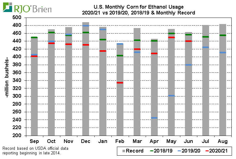 USDA reported 439.9 million bushels of corn was used for ethanol production in June, down from 448.9 million in May, and compared to 379.2 million bushels in June last year and 456.4 million in June 2019. This was a bit lower than we anticipated as there was an uptick in sorghum being used for ethanol production in June, as well as an apparent uptick in ethanol/corn yields to around 2.97 gallons/bushel from 2.92 in May, resulting in more ethanol being produced with less bushels of corn. Sept-June marketing year-to-date corn for ethanol usage of 4.162 billion bushels is up 3.5% from last year’s 4.020 billion and will require July-August usage of 888 million bushels in order to reach the USDA’s 5.050 billion bushel annual estimate, 6.1% higher than last year’s 837 million and 2.0% less than 2019’s 905 million. Over the last three weeks, ethanol production ran at an average decline to 2019 of 1.7% and was 5.8% above last year’s production last week as year ago production rates finally began to stabilize after the recovery from the COVID shock. The sharp rise in ethanol stocks in recent weeks has begun to put a bit of pressure on production rates but, overall, today’s data and recent-week ethanol production levels have supported the USDA’s annual demand estimate. USDA reported 1.930 million tons of DDGS were produced in June vs 1.943 million in May and 1.664 million tons last year, putting corn marketing year-to-date production at 17.755 million tons vs 16.750 million tons last year.