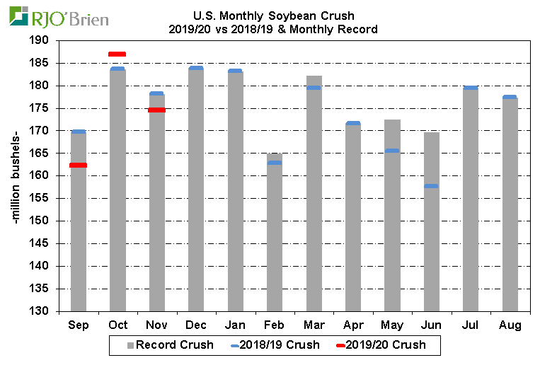 USDA reported 456.7 million bushels of corn was used for ethanol production in November, up from 433.1 million in October (revised down from 436.8 million initially reported) and 2.1 million bushels above last year’s 454.5 million bushels, the first year-over-year increase in corn for ethanol usage since September 2018. USDA reported 7.2 million bushels of sorghum was used for ethanol production in November, unchanged from October and a bit below last year’s 9.5 million, resulting in corn accounting for 98.4% of feedstocks used for ethanol for the month. For the first quarter of 2019/20, total corn for ethanol usage of 1.295 billion bushels was down 5.1% (70.3 million bushels) from last year’s 1.366 billion. Based on preliminary ethanol production estimates for the month, the average ethanol/corn yield in November of around 2.86 gallons/bushel was down from 2.95 in October and 2.96 in September, which is something that will need to be watched as more new crop supplies make their way into ethanol plants as a lower ethanol yield would imply a greater number of bushels of corn will be needed for each gallon of ethanol demand relatively speaking. We currently estimate ethanol production will need to run roughly 1.6% above year ago levels through the end of the marketing year in order for the USDA’s 5.375 billion bushel annual corn for ethanol usage estimate to be reached. While ethanol production has averaged 2.3% below last year so far in 2019/20, the last three weeks have averaged +2.7% year-over-year.