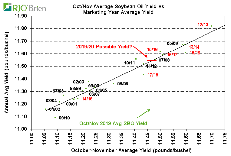 USDA reported November U.S. soybean crush was 174.6 million bushels, below average market expectations of 175.9 million bushels (175.0-177.0 million range of ideas) and down from 187.0 million in October and 1.9% below last year’s record November crush of 178.1 million bushels. For the first quarter of 2019/20, crush of 524.0 million bushels was down 1.3% from last year’s 530.9 million, leaving Dec-Aug crush needing to total 1.581 billion bushels in order for the USDA’s annual estimate of 2.105 billion bushels to prove correct in what would be a 1.3% increase from last year’s 1.561 billion bushels for the 9-month period. November U.S.-wide crush was 5.9% larger than NOPA-member crush for the month, less than the 6.4% and 6.6% differences in September and October. U.S. soybean oil production in November was 2.000 billion pounds, down from 2.148 billion in October and 2.061 billion last year November, with the U.S. average soybean oil yield ticking down to 11.45 pounds/bushel in November from 11.49 in October and last year’s 11.57 in November. The October-November average yield of 11.47 pounds/bushel compared to last year’s 11.60, which eventually saw the 2018/19 marketing year average soybean oil yield come in at 11.61 pounds/bushels. As seen in the 2nd chart below, the relationship between the Oct-Nov average soybean oil yield and the marketing year average yield is a rather strong one, with the 11.47 Oct-Nov average this year implying a marketing year average yield likely in the 11.50-11.55 range given the situation in recent years in particular. USDA is currently assuming the 2019/20 soybean oil yield essentially unchanged from last year at 11.60 pounds/bushel. USDA reported end November U.S. soybean oil stocks were 1.880 billion pounds, up from 1.821 billion in October and well above average market expectations of 1.839 billion pounds and the range of ideas of 1.802-1.870 billion, while being only marginally below last year’s November stocks of 1.900 billion pounds. Based on estimated exports in November, domestic soybean oil usage was implied down roughly 13% from last year after October domestic usage was down 4.3% from last year. U.S. soybean meal production in November of 4.112 million tons was down from 4.377 million in October and essentially unchanged from 4.155 million last year. November soybean meal demand was implied down roughly 3-4% from last year vs unchanged in October.
