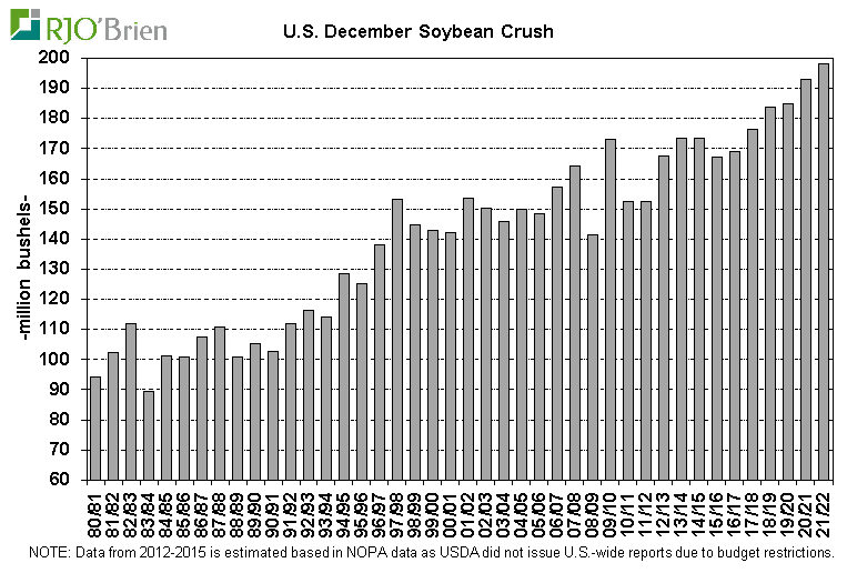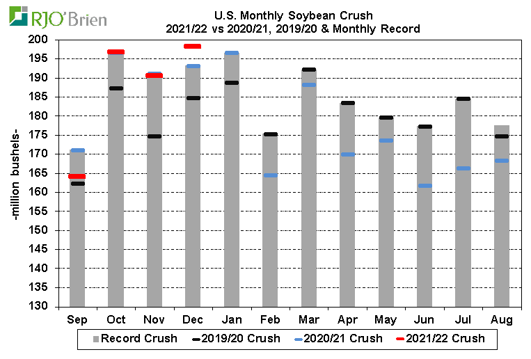 USDA reported U.S. soybean crush in December was 198.2 million bushels, a new all-time monthly record in exceeding October’s 196.9 million and was higher than average market expectations of 197.7 million bushels (197.3-198.4 million range of ideas), was up from November’s 190.6 million and 2.6% higher than year ago Dec crush of 193.1 million bushels. Through the first four months of 2021/22, cumulative crush of 750 million bushels is nearly identical to last year’s 752 million and leaves January-August crush needing to total 1.440 billion bushels in order to reach the USDA’s 2.190 billion bushel annual estimate, which would be 3.7% (51 million bushels) larger than last year’s 1.389 billion bushels during the same period. With crush margins remaining historically strong and year ago crush rather weak during Feb-Aug (see 2nd chart below), we see no issues reaching the USDA’s current annual estimate and continue to expect 2021/22 crush to prove higher as we’re at 2.210 billion bushels in our balance sheet, which would require Jan-Aug crush to run 5.1% above year ago levels.