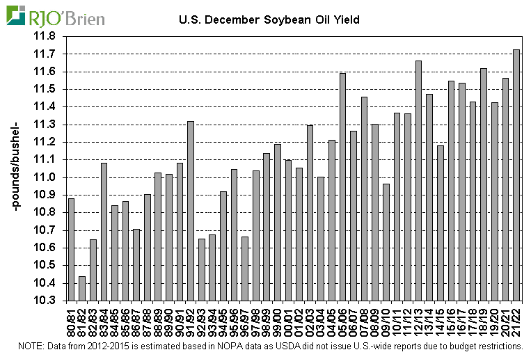 USDA reported U.S. soybean oil production in December was 2.324 billion pounds, up from 2.235 billion in November and last year’s 2.223 billion pounds, putting October-December marketing year-to-date production at 6.907 billion pounds vs 6.723 billion last year. December nationwide soybean oil production was 6.1% larger than that reported by NOPA members, in line with the 5.9% difference in November, but less than the 6.8% average difference during the previous five months (June-Oct). The U.S. average soybean oil yield in December held steady at 11.72 pounds/bushel relative to November’s 11.73 and continues to run solidly above last year’s 11.56 in December/11.55 November. Through the first three months of 2021/22, the average soybean oil yield of 11.79 pounds/bushels is running solidly above last year’s 11.58 so far.