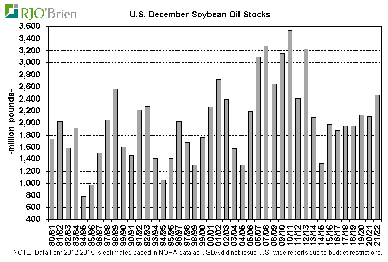 USDA reported end December U.S. soybean oil stocks were 2.466 billion pounds, well below average market expectations of 2.565 billion (2.490-2.630 billion range of ideas) and up only modestly from November stocks of 2.406 billion pounds, but were still significantly (16.8%/355 million pounds) above year ago Dec stocks of 2.111 billion pounds. The 60 million pound increase in stocks from November was certainly less than expected given the record crush for the month and the 89 million pound increase in soybean oil production and, particularly, in comparison to NOPA-member stocks in December which jumped 199 million pounds from November. Additionally, nationwide soybean oil stocks in December were only 21.4% larger than NOPA-member stocks, significantly below the 31.3% difference in November, the 29.2% average difference over the previous 12 months, the smallest percentage difference between NOPA and nationwide stocks in 23 months and 2nd smallest difference since USDA began reporting monthly crush data again in May 2015 (stopped for several years due to budget constraints), going back 80 months. If it weren’t for last year’s December soybean oil stocks also deviating considerably lower relative to NOPA stocks (24.3% difference), we would be inclined to feel there may be an error in reported December stocks, but month-to-month deviations such as this do occur at times. Regardless of the lower-than-expected stocks, December implied soybean oil domestic usage was only up roughly 1.8% from last year, below the 4.8% and 3.4% year-over-year increases posted in November and October, respectively. Through the first three months of 2021/22, implied domestic usage is up 3.3% from last year vs USDA currently estimating marketing year total domestic usage to be up 7.8% from 2020/21. Moreover, December stocks of 2.466 billion pounds still easily reflects the highest stocks for the month in 9 years and were 15.5% (333 mil pounds) larger than any December stocks since 2013.