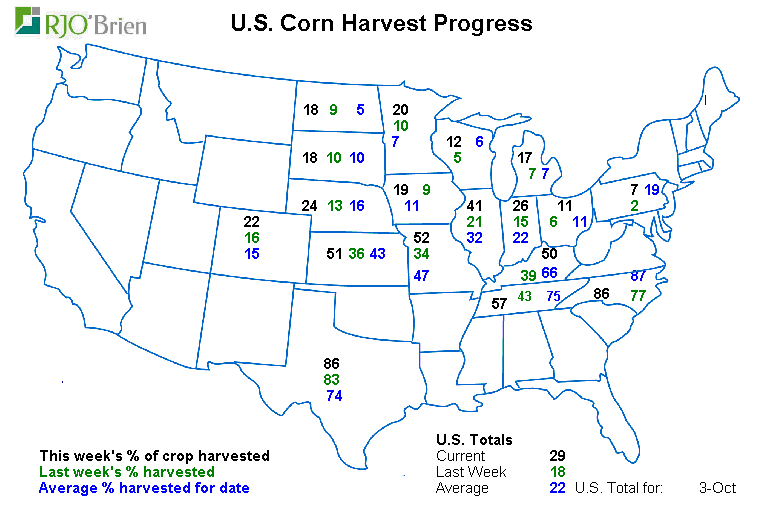 -Corn harvested 29% complete vs 29% expected (27-32% range of ideas), 18% last week, 22% average