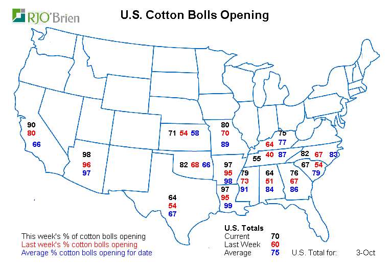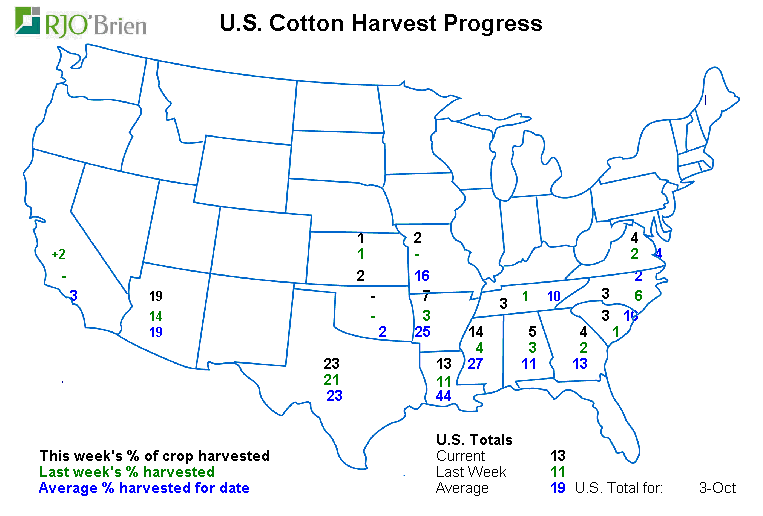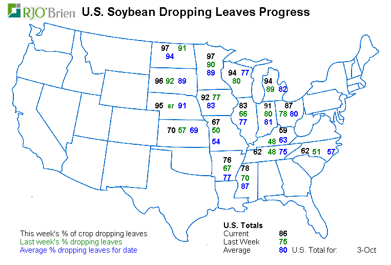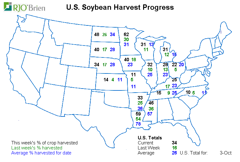 -Soybean harvested 34% complete vs 32% expected (28-40% range of ideas), 16% last week, 26% average
