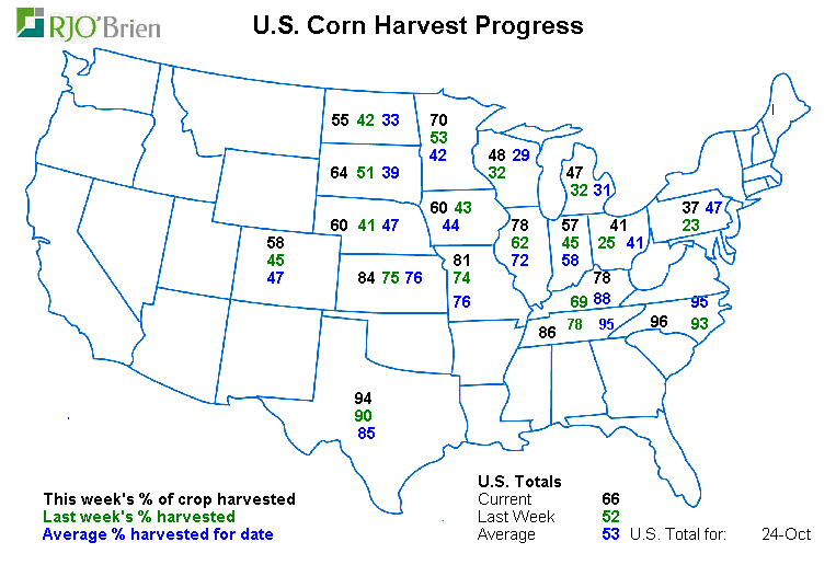 -Corn harvested 66% complete vs 65% expected (62-68% range of ideas), 52% last week, 53% average