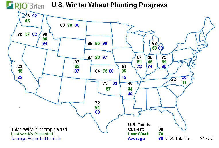 -Winter wheat planted 80% complete vs 81% expected (78-85% range of ideas), 70% last week, 80% average