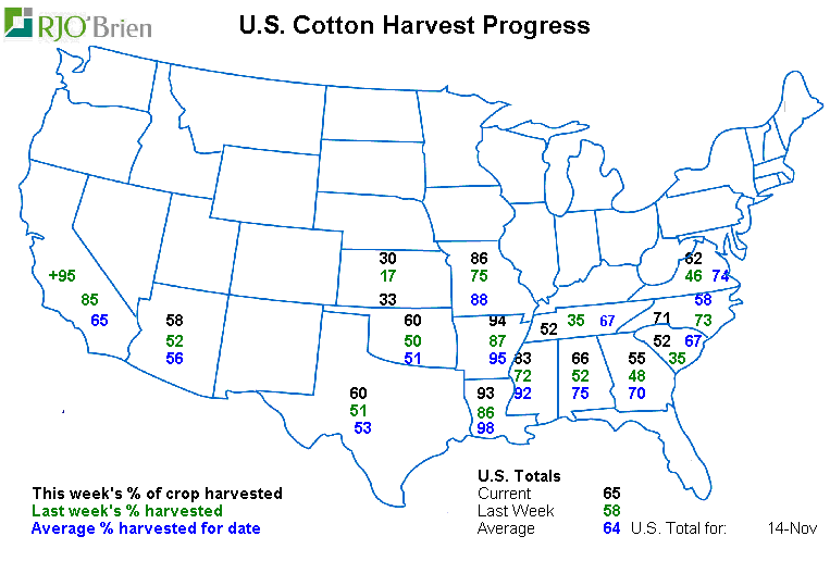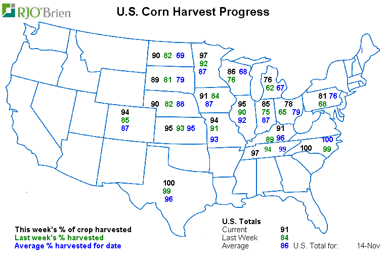 -Corn harvested 91% complete vs 91% expected (90-92% range of ideas), 84% last week, 86% average