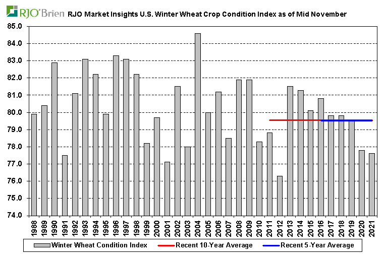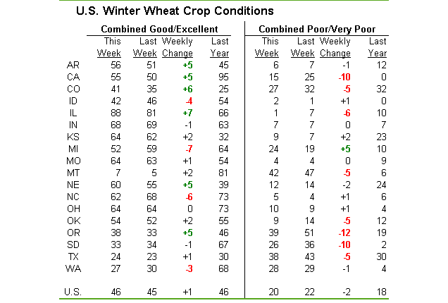 -Winter wheat conditions 46% good/excellent vs 45% expected (44-47% range of ideas), 45% last week, 46% last year