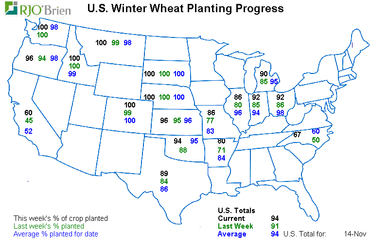 -Winter wheat planted 94% complete vs 95% expected (94-96% range of ideas), 91% last week, 94% average