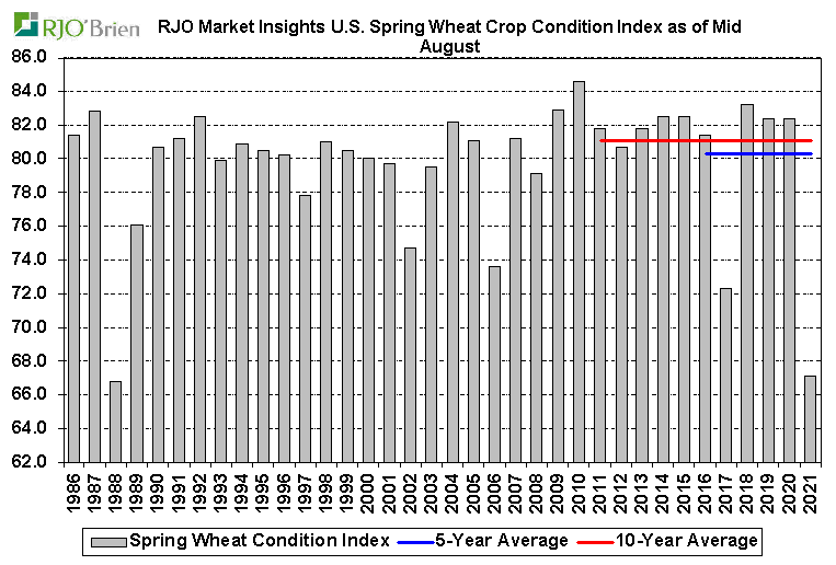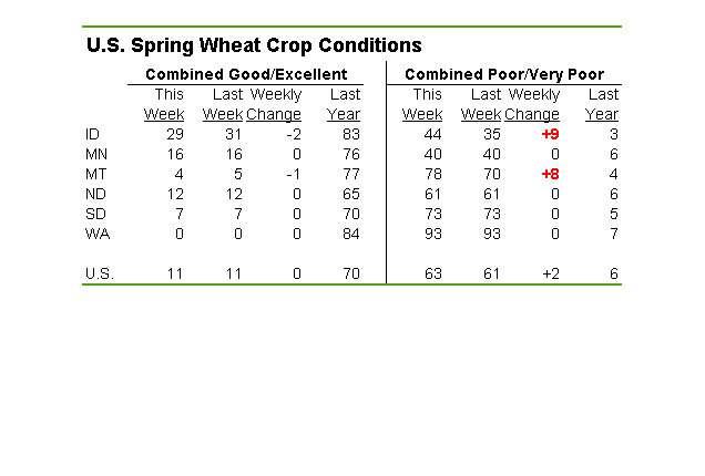 -Spring wheat conditions 11% good/excellent vs 11% expected (10-12% range of ideas), 11% last week, 70% last year