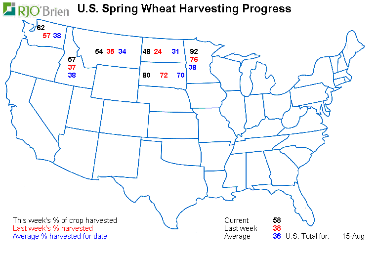 -Spring wheat harvest 58% complete vs 57% expected (50-66% range of ideas), 38% last week, 36% average