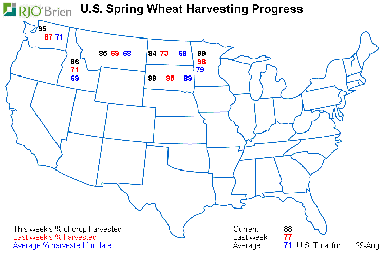-Spring wheat harvest 88% complete vs 89% expected (87-92% range of ideas), 77% last week, 71% average
