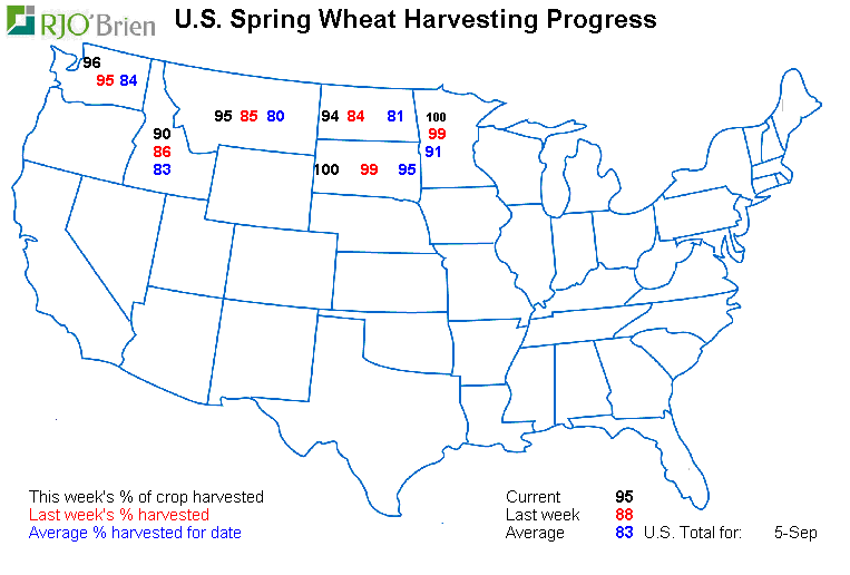-Spring wheat harvest 95% complete vs 95% expected (93-96% range of ideas), 88% last week, 83% average
