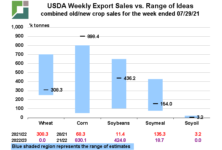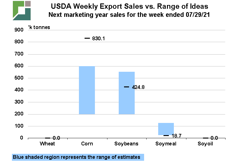 U.S. corn sales, for the week ended 7/29/21, were 68k tonnes (2.7 million bushels), within market expectations of -150k to +200k tonnes and returned to being net positive after the prior two weeks’ net cancellations of 4.5 million and 3.5 million bushels. Over the last eight weeks, corn sales have averaged a minimal 2.1 million bushels/week, increasing the potential for 2020/21 exports to fall short of the USDA’s 2.850 billion bushel export projection. Fine-tuning the “needed” sales pace to reach the USDA’s export estimate in the final weeks of the marketing year becomes difficult due to the delayed nature of official Census Bureau export data, but we estimate corn sales may need to average 10-12 million bushels/week during the month of August to allow export to reach the USDA’s estimate, which clearly has not been the case of late. This week’s old crop activity again included net cancellations by China of 113k tonnes, while they still have nearly 2.6 MMT of old crop purchases on the books, which essentially all will need to be shipped in the next four weeks if the USDA’s projection is to be met. Total commitments of 2.745 billion bushels compare to 1.724 MMT last year. New crop sales of 830k tonnes (32.7 mil bu) were above market expectations of 200-600k tonnes, but featured no sales to China while Mexico bought 239k tonnes and Japan 211k tonnes. Total new crop sales of 688 million bushels compare to 430 million last year.