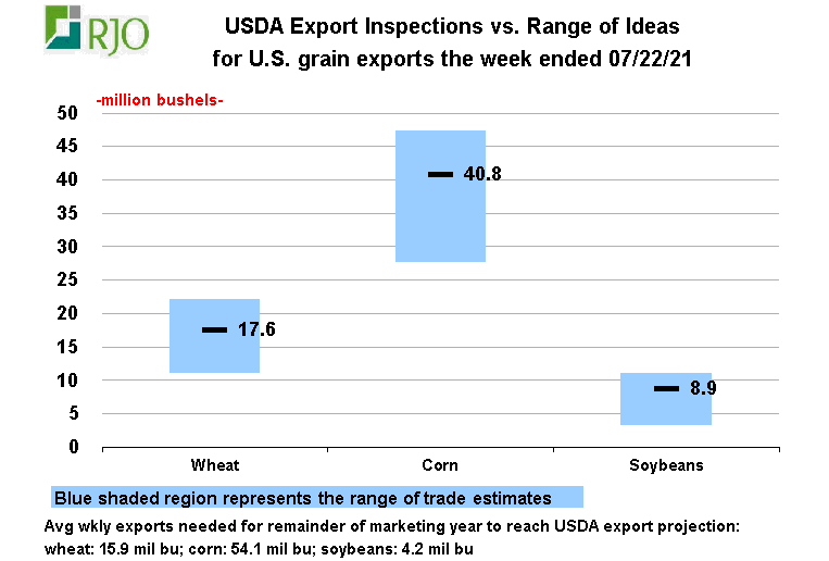 U.S. corn exports, for week ended 7/22/21, were 1.037 MMT (40.8 million bushels), within market expectations of 700k-1.2 MMT (27.6-47.2 mil bu), comparable to the previous week’s 1.077 MMT (42.4 mil bu) and above year ago same-week exports of 841k tonnes (33.1 mil bu) but, most importantly, again below the roughly 54 million bushels/week we estimate is needed through the end of August in order to reach the USDA’s 2.850 billion bushel export projection. In fact, each of the last five week’s exports were below the current “needed” pace, averaging 42.4 million bushels during the period, nearly 22% below our estimate of the pace necessary to reach the USDA’s estimate. Shipments to China last week were 490k tonnes, leaving them with roughly 3.9 MMT (155 mil bu) in outstanding purchases still on the books for 2020/21 with only five full weeks remaining in the marketing year. Accordingly, they would need to ship roughly 700-750k tonnes/week in order to ship the major of old crop purchases prior to the end of 2020/21, which is likely to be required if the USDA’s current projection is to be met, but have been falling short of the pace in recent weeks. Cumulative export inspections of 2.412 billion bushels compares to 1.471 billion last year, but keep in mind official Census Bureau exports through May were running more than 100 million bushels larger than Inspections data.