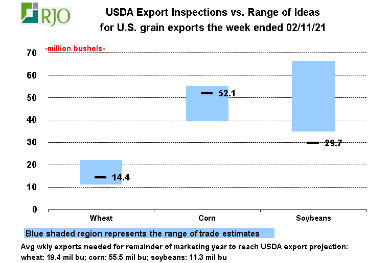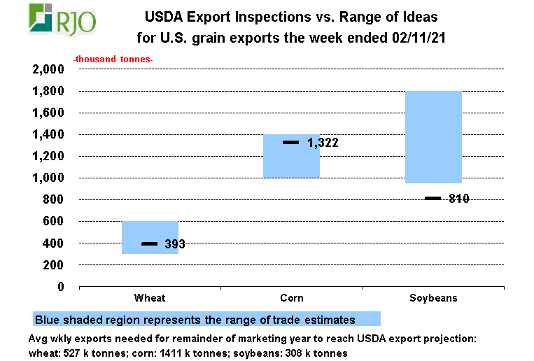 U.S. soybean exports, for the week ended 2/11/21, were 810k tonnes (29.7 million bushels), below market expectations of 950k-1.8 MMT (34.9-66.1 million bushels), down sharply from the previous week’s 1.904 MMT (70.0 mil bu), below last year’s same-week exports of 1.005 MMT (36.9 million bushels) and easily the lowest of the 2020/21 marketing year so far. The previous weekly low exports were 47.6 million bushels. Over the previous four weeks, soybean exports averaged 75.2 million bushels/week. While a single week is not a certain indication, it is likely this week’s exports represent the start to the much-needed sharp seasonal decline in soybean exports with Brazilian exports finally ramping up. Shipments to China this week were only 405k tonnes, reducing their “known” unshipped purchases to around 1.9 MMT, but possibly closer to 3.5 MMT when taking into account likely purchases still reflected as “unknown.” Cumulative export inspections of 1.840 billion bushels compare to 1.038 billion last year, leaving weekly exports needing to average roughly 11.3 million bushels/week through the end of August to reach the USDA’s 2.250 billion bushel export projection vs last year’s 19.8 million/week average from this point forward.