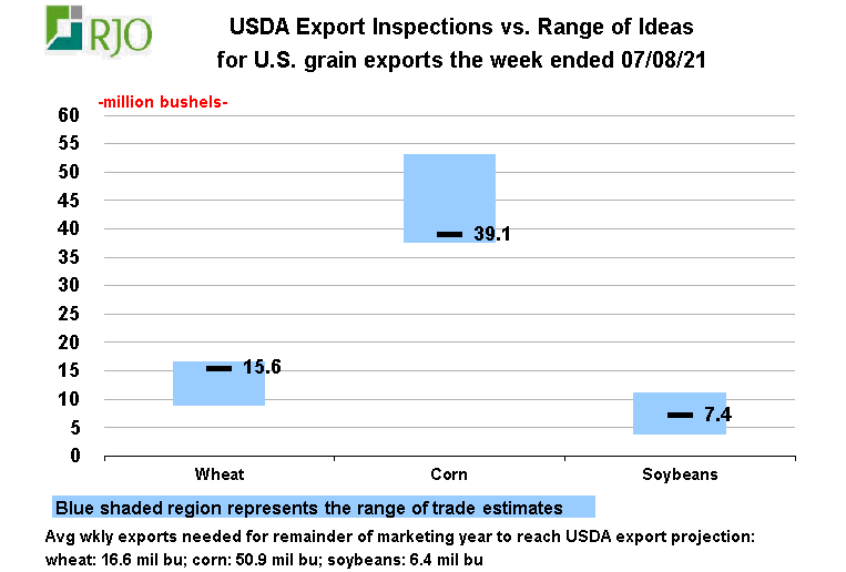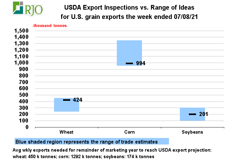 U.S. corn exports, for the week ended 7/08/21, of 994k tonnes (39.1 million bushels) were at the lower end of market expectations of 950k-1.35 MMT (37.4-53.1 million bushels), down from the previous week’s 48.7 million bushels, below the roughly 51 million bushels/week we estimate is needed through the end of August to reach the USDA’s export projection and were the lowest in 25 weeks. While corn exports remain solid overall, there is no doubt they have slowed of late, with two of the last three week’s exports falling below the “needed” pace by a moderate degree and opening the door for the potential of 2020/21 exports falling a bit short of the USDA’s 2.850 billion bushel projection – the first time we’ve felt that sentiment since last fall. Over the last three weeks, corn exports averaged 42.8 million bushels/week, roughly 6% below the current “needed” pace. This week’s exports included 478k tonnes to China, below the roughly 700k/week which is needed in order to to fully ship their outstanding purchases on the books before the end of the marketing year. Cumulative export inspections of 2.329 billion bushels are up 68% from last year, but keep in mind official Census Bureau exports were running 105 million bushels larger than Inspections data through May and likely to be closer to 140 million bushels in total for the 2020/21 marketing year.