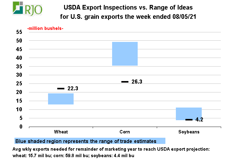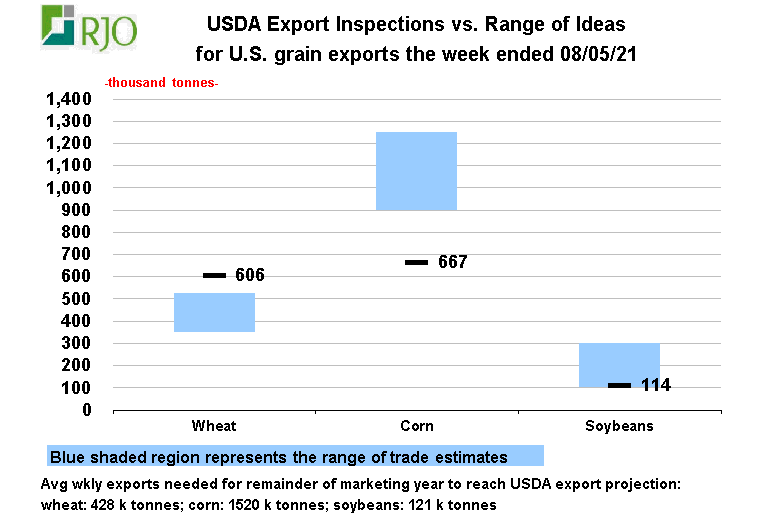 U.S. corn exports, for the week ended 8/05/21, were 667 tonnes (26.3 million bushels), below market expectations of 900k-1.25 MMT (35.4-49.2 mil bu), down from the previous week’s 1.397 MMT (55.0 mil bu) and, most importantly, well below the roughly 60 million bushels/week we estimate will be needed over the final four weeks of 2020/21 in order to reach the USDA’s 2.850 billion bushel export projection. In fact, this week’s exports were quite disappointing, being a marketing year low and including only 138k tonnes to China vs the 700-800k/week they’ve been shipping in most weeks of late and leaving them with roughly 2.4 MMT (96 million bushels) in old crop purchases still on the books. Based on the overall pace of shipping, it has been a long-held expectation that the majority of China’s old crop purchases would need to be shipped by the end of August if the USDA’s export projection is to be met, but the slowdown in activity of late certainly raises some red flags. Cumulative export inspections of 2.501 billion bushels are still up 61% from last year, matching the USDA’s current estimated percent change in annual exports, but obviously, a few more disappointing weeks would change that perspective. Keep in mind, official Census Bureau export data is running more than 100 million bushels larger than that indicated by Inspections data, which is already taken into account in our estimated “needed” shipment pace.