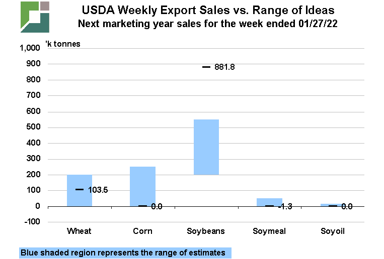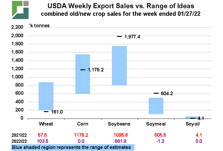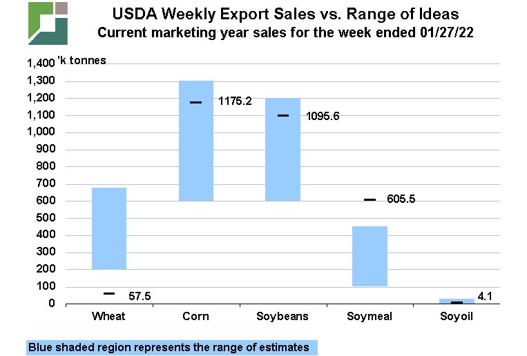 U.S. corn sales, for the week ended 1/27/22, were 1.175 MMT (46.3 million bushels), within market expectations of 600k-1.3 MMT and comparable to sales of the previous two weeks of 55.2 million and 43.0 million bushels, but went up again massive sales last year this week of 293 million bushels as China made significant purchases. Given this, total commitments of 1.776 billion bushels fell to a near 20% deficit to last year’s 2.209 billion after running 9-10% below last year in recent weeks. China made another significant purchase of U.S. corn in mid-March last year so it is unlikely the year-over-year shortfall in sales will gain much ground anytime soon. Activity by China for the week was minimal again, with their total purchases sitting at 12.4 MMT vs last year’s 17.7 MMT at this time, while unshipped sales are now at 9.0 MMT vs 11.6 MMT a year ago this week. The largest sales this week went to Japan with 417k tonnes and Mexico with 212k tonnes. We estimate corn sales will need to average roughly 20.2 million bushels/week through the end of August vs last year’s 18.3 million/week average from this point forward.