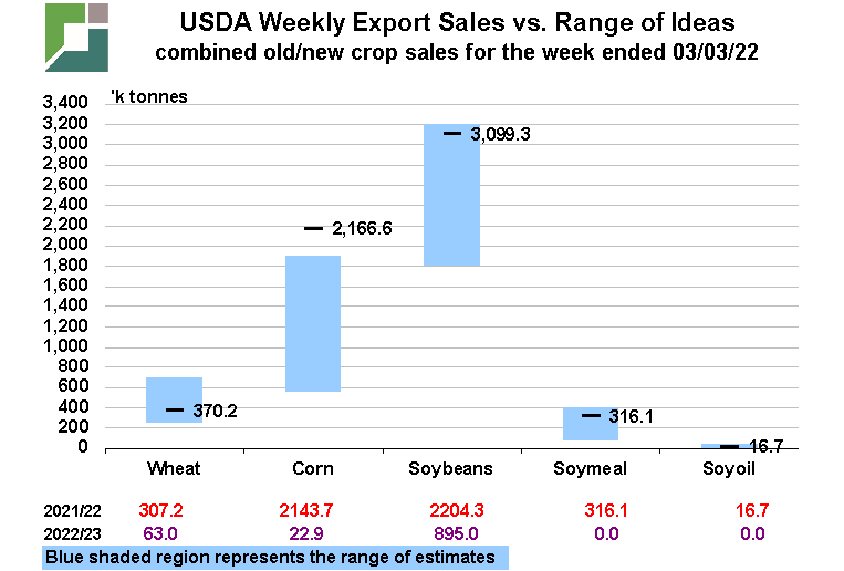 U.S. corn sales, for the week ended 3/03/22, were quite large at 2.144 MMT (84.4 million bushels), sharply above market expectations of 500k-1.2 MMT, last week’s 19.1 mil bu, last year’s 15.5 mil bu and was a new marketing year high. The largest activity for the week was to unknown with new sales of at least 1.0 MMT, with the largest reported sales going to Japan with 381k and Mexico with 331k. Activity by China was minimal, as they now have 6.6 MMT of unshipped U.s. corn still on the books vs 11.3 MMT at this time last year. Total commitments of 1.976 billion bushels are now down only 16% from last year’s 2.343 billion, the smallest year-over-year deficit in six weeks, with sales now needing to average roughly 19 million bushels/week through the end of August in order to reach the USDA’s just-raised 2.500 billion bushel export projection vs last year’s 16.5 million/week average from this point forward. This week’s report reflects the first significant increase in sales activity since the Russian/Ukrainian conflict heated up. New crop sales were only 22k tonnes vs expectations of 50k-700k tonnes, with 22/23 total sales of 76 mil bu comparable to last year’s new crop sales of 61 mil bu at this time.